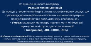 IV. Вивчення нового матеріалу Реакція поліконденсації Це процес утворення полімерів із низькомолекулярних сполук, що супроводжується виділенням побічних низькомолекулярних продуктів (найчастіше води, амоніаку, хлороводню). Умова: Молекули мономеру повинні мати мінімум дві функціональні групи, здатні до взаємодії (наприклад, -OH, -COOH, -NH₂). Особливість поліконденсації: Маса утвореного полімеру менша за суму мас вихідних мономерів, оскільки частина речовини виділяється у вигляді побічного низькомолекулярного продукту. Елементний склад полімеру відрізняється від складу мономеру.