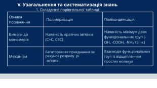 Ознака порівняння Полімеризація Поліконденсація. Вимоги до мономерів. Наявність кратних зв'язків (C=C, C≡C)Наявність мінімум двох функціональних груп (-OH, -COOH, -NH₂ та ін.)Механізм. Багаторазове приєднання за рахунок розриву pi -зв'язків. Взаємодія функціональних груп із відщепленням простих молекул. V. Узагальнення та систематизація знань 1. Складання порівняльної таблиці