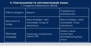Побічні продукти. ВідсутніУтворюються (H2O,NH3,HCl)Зміна маси та складу. Маса полімеру = масі мономерів. Склад не змінюється. Маса полімеру < маси мономерів. Склад змінюється. Приклади полімерів. Поліетилен, поліпропілен, тефлон, ПВХКапрон, лавсан (поліестери), фенолформальдегідні смоли. V. Узагальнення та систематизація знань 1. Складання порівняльної таблиці