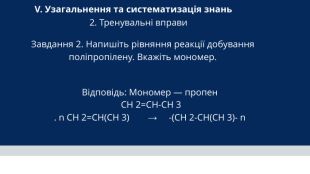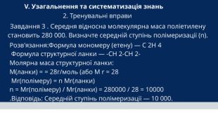V. Узагальнення та систематизація знань 2. Тренувальні вправи Завдання 3 . Середня відносна молекулярна маса поліетилену становить 280 000. Визначте середній ступінь полімеризації (n). Розв'язання: Формула мономеру (етену) — C 2 H 4 Формула структурної ланки — -CH 2-CH 2- Молярна маса структурної ланки: M(ланки) = = 28г/моль (або M r = 28 Mr(полімеру) = n Mr(ланки)n = Mr(полімеру) / Mr(ланки) = 280000 / 28 = 10000. Відповідь: Середній ступінь полімеризації — 10 000.