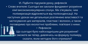 VI. Підбиття підсумків уроку, рефлексія Слово вчителя: Сьогодні ми заклали фундамент розуміння хімії високомолекулярних сполук. Ми з'ясували, чим полімеризація відрізняється від поліконденсації. На наступних уроках ми детальніше розглянемо властивості та застосування цих матеріалів, пластмас і волокон, а також поговоримо про екологічні проблеми, пов'язані з ними. Рефлексія: Що сьогодні було найскладнішим для розуміння?Чи зможете ви тепер, дивлячись на формулу полімеру, сказати, яким методом його отримали?