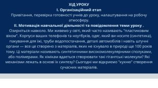 ХІД УРОКУІ. Організаційний етап Привітання, перевірка готовності учнів до уроку, налаштування на робочу атмосферу.ІІ. Мотивація навчальної діяльності та повідомлення теми уроку . Озирніться навколо. Ми живемо у світі, який часто називають "пластиковим віком". Корпуси ваших телефонів та ноутбуків, одяг, який ви носите (синтетика), пакування для їжі, труби водопостачання, деталі автомобілів і навіть штучні органи — все це створено з матеріалів, яких не існувало в природі ще 100 років тому. Ці матеріали називають синтетичними високомолекулярними сполуками, або полімерами. Як хімікам вдається створювати такі гігантські молекули? Які механізми лежать в основі їх синтезу? Сьогодні ми відкриємо "кухню" створення сучасних матеріалів.
