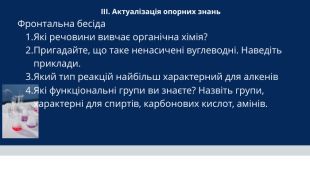 ІІІ. Актуалізація опорних знань Фронтальна бесіда Які речовини вивчає органічна хімія? Пригадайте, що таке ненасичені вуглеводні. Наведіть приклади. Який тип реакцій найбільш характерний для алкенів Які функціональні групи ви знаєте? Назвіть групи, характерні для спиртів, карбонових кислот, амінів.