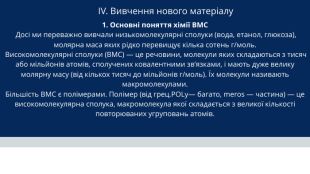 IV. Вивчення нового матеріалу 1. Основні поняття хімії ВМС Досі ми переважно вивчали низькомолекулярні сполуки (вода, етанол, глюкоза), молярна маса яких рідко перевищує кілька сотень г/моль. Високомолекулярні сполуки (ВМС) — це речовини, молекули яких складаються з тисяч або мільйонів атомів, сполучених ковалентними зв’язками, і мають дуже велику молярну масу (від кількох тисяч до мільйонів г/моль). Їх молекули називають макромолекулами. Більшість ВМС є полімерами. Полімер (від грец. POLy— багато, meros — частина) — це високомолекулярна сполука, макромолекула якої складається з великої кількості повторюваних угруповань атомів.