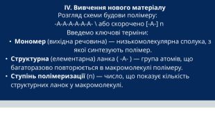 Розгляд схеми будови полімеру: -A-A-A-A-A-A- \ або скорочено [-A-] n Введемо ключові терміни: Мономер (вихідна речовина) — низькомолекулярна сполука, з якої синтезують полімер. Структурна (елементарна) ланка ( -A- ) — група атомів, що багаторазово повторюється в макромолекулі полімеру. Ступінь полімеризації (n) — число, що показує кількість структурних ланок у макромолекулі. IV. Вивчення нового матеріалу