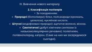 IV. Вивчення нового матеріалу 2. Класифікація полімерів За походженням: Природні (біополімери): білки, полісахариди (крохмаль, целюлоза), нуклеїнові кислоти. Штучні (модифіковані природні): ацетатне волокно, віскоза. Синтетичні (добуті хімічним синтезом із низькомолекулярних речовин): поліетилен, полівінілхлорид, капрон. (Саме на них ми зосередимося сьогодні).