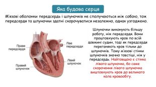 Яка будова серця. М’язові оболонки передсердь і шлуночків не сполучаються між собою, тож передсердя та шлуночки здатні скорочуватися незалежно, однак узгоджено. Шлуночки виконують більшу роботу, ніж передсердя. Вони проштовхують кров по всій довжині судин, тоді як передсердя переганяють кров тільки до шлуночків. Тому м’язові стінки шлуночків значно товстіші, ніж у передсердь. Найтовщою є стінка лівого шлуночка, бо саме скорочення лівого шлуночка виштовхують кров до великого кола кровообігу.