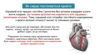 Як серце постачається кров’ю. Серцевий м’яз працює постійно і ритмічно без зупинки впродовж усього життя людини. Це головна фізіологічна відмінність між серцевим і скелетними м’язами. Тому серцевий м’яз потребує постійного надходження з кров’ю великої кількості кисню та поживних речовин. Для цього серце має дві коронарні, або вінцеві (від лат. корона - вінець), артерії, що розгалужуються на безліч дрібних судин, аж до капілярів. Порушення постачання серця артеріальною кров’ю становить смертельну небезпеку. Його наслідком може бути інфаркт міокарда, який супроводжується змертвінням ділянки серцевого м’яза.