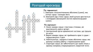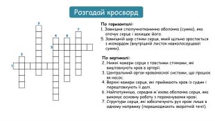 Розгадай кросворд. По горизонталі: 1. Зовнішня сполучнотканинна оболонка (сумка), яка оточує серце і захищає його. 5. Зовнішній шар стінки серця, який щільно зростається з міокардом (внутрішній листок навколосерцевої сумки). По вертикалі: 2. Нижні камери серця з товстими стінками, які виштовхують кров в артерії. 3. Центральний орган кровоносної системи, що працює як насос. 4. Верхні камери серця, які приймають кров із судин і перештовхують її далі. 6. Найпотужніша, середня м'язова оболонка серця, яка виконує основну роботу з перекачування крові.7. Структури серця, які забезпечують рух крові лише в одному напрямку (перешкоджають зворотній течії).