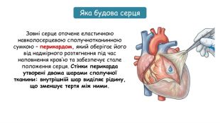Яка будова серця. Зовні серце оточене еластичною навколосерцевою сполучнотканинною сумкою – перикардом, який оберігає його від надмірного розтягнення під час наповнення кров’ю та забезпечує стале положення серця. Стінки перикарда утворені двома шарами сполучної тканини: внутрішній шар виділяє рідину, що зменшує тертя між ними.