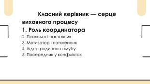 Класний керівник — серце виховного процесу1. Роль координатора2. Психолог і наставник3. Мотиватор і натхненник4. Лідер родинного клубу5. Посередник у конфліктах