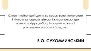 В. О. СУХОМЛИНСЬКИЙСлово - найтонший дотик до серця; воно може стати і ніжною запашною квіткою, і живою водою, що повертає віру в добро, і гострим ножем, і розпеченим залізом, і брудом...