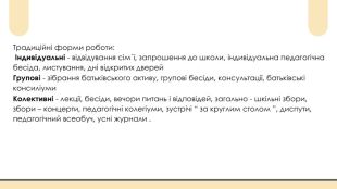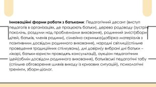 Інноваційні форми роботи з батьками: Педагогічний десант (виступ педагогів в організаціях, де працюють батьки), дерево родоводу (зустрічі поколінь, роздуми над проблемами виховання), родинний зміст(збори дітей, батьків, членів родини), сімейна скринька(добірка матеріалів з позитивним досвідом родинного виховання), народні світлиці(спільне проведення традиційних спілкувань), дні довіри(у вибрані дні батьки – лікарі, батьки-юристи проводять консультації), аукціон педагогічних ідей(обмін досвідом родинного виховання), батьківські педагогічні тaбу (спільне обговорення шляхів виходу із кризових ситуацій), психологічні тренінги, збори-діалог.