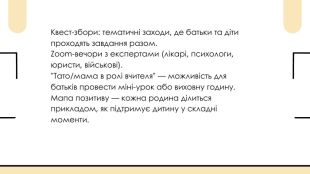 Квест-збори: тематичні заходи, де батьки та діти проходять завдання разом. Zoom-вечори з експертами (лікарі, психологи, юристи, військові)."Тато/мама в ролі вчителя" — можливість для батьків провести міні-урок або виховну годину. Мапа позитиву — кожна родина ділиться прикладом, як підтримує дитину у складні моменти.