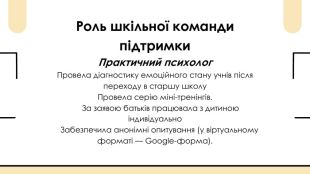 Роль шкільної команди підтримки. Практичний психолог. Провела діагностику емоційного стану учнів після переходу в старшу школу. Провела серію міні-тренінгів. За заявою батьків працювала з дитиною індивідуально Забезпечила анонімні опитування (у віртуальному форматі — Google-форма).