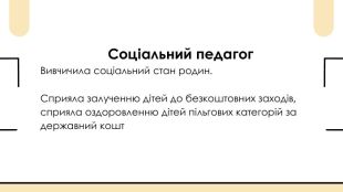 Соціальний педагог. Вивчичила соціальний стан родин. Сприяла залученню дітей до безкоштовних заходів, сприяла оздоровленню дітей пільгових категорій за державний кошт