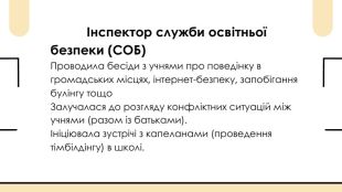 Інспектор служби освітньої безпеки (СОБ)Проводила бесіди з учнями про поведінку в громадських місцях, інтернет-безпеку, запобігання булінгу тощо. Залучалася до розгляду конфліктних ситуацій між учнями (разом із батьками).Ініціювала зустрічі з капеланами (проведення тімбілдінгу) в школі.