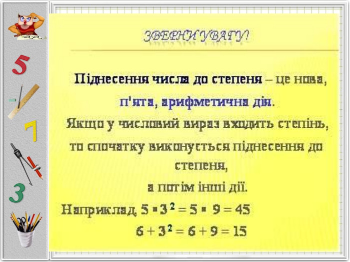• обчислюють значення степенів (наприклад, 2^3, 5^2).
