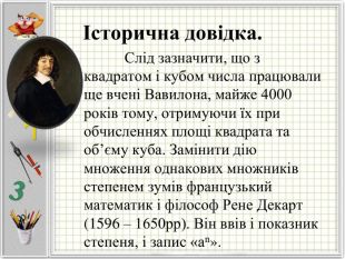 Історична довідка. Слід зазначити, що з квадратом і кубом числа працювали ще вчені Вавилона, майже 4000 років тому, отримуючи їх при обчисленнях площі квадрата та об’єму куба. Замінити дію множення однакових множників степенем зумів французький математик і філософ Рене Декарт (1596 – 1650рр). Він ввів і показник степеня, і запис «аn».