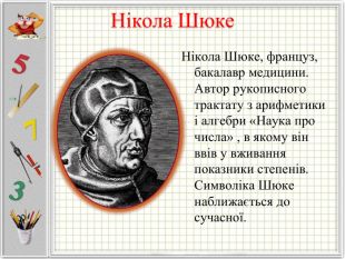 Нікола Шюке, француз, бакалавр медицини. Автор рукописного трактату з арифметики і алгебри «Наука про числа» , в якому він ввів у вживання показники степенів. Символіка Шюке наближається до сучасної.