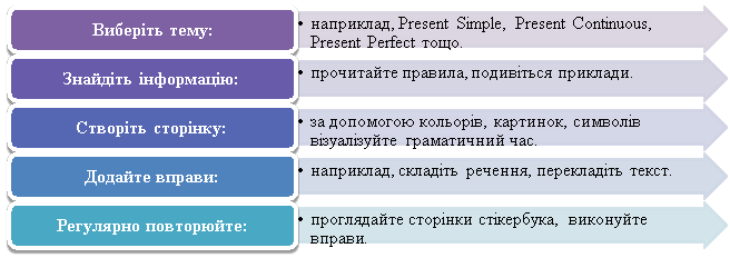 Стікербук допомагає учням організувати та систематизувати знання про англійські часи. Таблиці, схеми та інші структуровані записи роблять інформацію більш доступною та зрозумілою. |