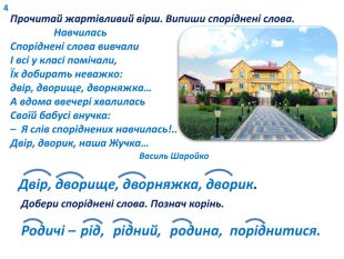 4 Прочитай жартівливий вірш. Випиши споріднені слова. Навчилась. Споріднені слова вивчалиІ всі у класі помічали,Їх добирать неважко:двір, дворище, дворняжка…А вдома ввечері хвалилась Своїй бабусі внучка:– Я слів споріднених навчилась!.. Двір, дворик, наша Жучка… Василь Шаройко. Двір, дворище, дворняжка, дворик. Добери споріднені слова. Познач корінь. Родичі – рід, рідний, родина, поріднитися.