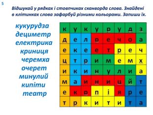 кукурудзделречоаекеетречцтримемхикинулиамаиницйтекрпіяретркитита5 Відшукай у рядках і стовпчиках сканворда слова. Знайдені в клітинках слова зафарбуй різними кольорами. Запиши їх.кукурудзадециметрелектрикакриницячеремхаочеретминулийкипітитеатр