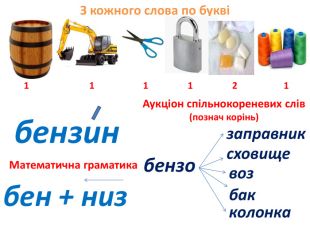 З кожного слова по букві 1 1 1 1 2 1 бензин. Математична граматикабен + низ Аукціон спільнокореневих слів(познач корінь)баквоззаправниксховищеколонкабензо