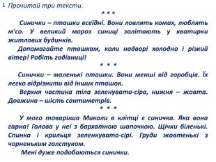 1 Прочитай три тексти.* * * Синички – пташки всеїдні. Вони ловлять комах, люблять м‘со. У великий мороз синиці залітають у кватирки житлових будинків. Допомагайте пташкам, коли надворі холодно і різкий вітер! Робіть годівниці!* * * Синички – маленькі пташки. Вони менші від горобців. Їх легко відрізнити від інших пташок. Верхня частина тіла зеленувато-сіра, нижня – жовта. Довжина – шість сантиметрів.* * * У мого товариша Миколи в клітці є синичка. Яка вона гарна! Голова у неї з бархатною шапочкою. Щічки біленькі. Спинка і крильця зеленкувато-сірі. Груди жовтенькі з чорненьким галстуком. Мені дуже подобаються синички.