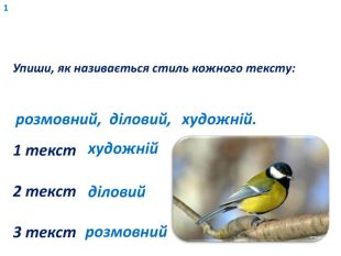 1 Упиши, як називається стиль кожного тексту:1 текст2 текст3 текст розмовний, діловий, художній.художнійділовийрозмовний