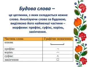 Будова слова – це цеглинки, з яких складається кожне слово. Аналізуючи слово за будовою, виділяємо його найменші частини – морфеми: префікс, суфікс, корінь, закінчення.
