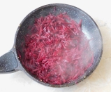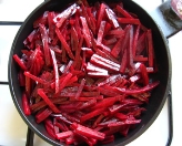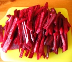 Буряки миють і варять з оцтом, обчищають і нарізують соломкою, картоплю варять, обчищають і нарізують.