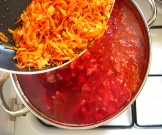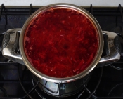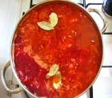 Потім у борщ кладуть варену квасолю з відваром, нарізаний соломкою солодкий перець, тушковані з томатним пюре, оцтом і олією буряки, нарізані соломкою, пасеровані на олії нарізані соломкою моркву, петрушку, цибулю з борошном, розведені невеликою кількістю води, і варять 7-10 хв.