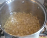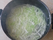 У киплячу воду кладуть нарізану соломкою капусту, доводять до кипіння, додають нарізану часточками картоплю і варять 10-15 хв.