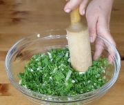 Зелену цибулю нарізають, а частину цибулі розтирають з сіллю до появи соку.