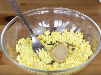 Білки круто зварених яєць нарізають, а жовтки розтирають з частиною сметани, гірчицею, сіллю, цукром і розводять квасом.