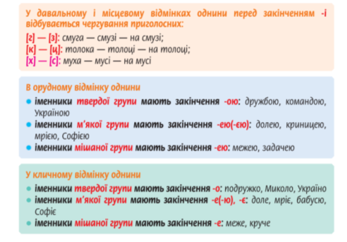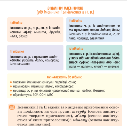 Очікувані результати: Учень / учениця самостійно визначає відміни іменників у тексті, правильно відмінює іменники першої відміни.