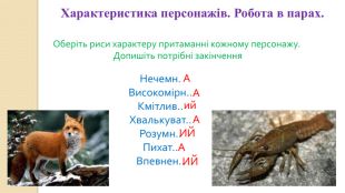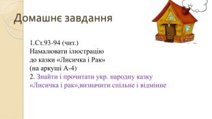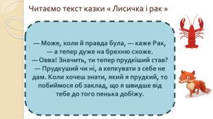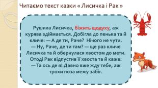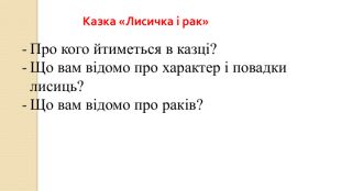 Мета:ознайомити учнів з казкою « Лисиця та рак» та творчістю українського письменника І.Я. Франка, формувати вміння правильно, виразно, свідомо читати, давати повні відповіді на запитання; вміння голосом передавати думки і стан кожного персонажа ;розвивати пізнавальні та творчі здібності школярів, усне мовлення, логічне мислення; збагачувати словниковий запас учнів; виховувати повагу одне до одного, бажання бути добрими, чемними.