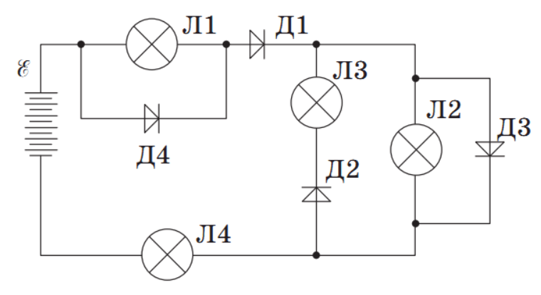 Визнач, яка з лампочок Л1, Л2, Л3 або Л4, зображених на схемі електричного кола, може світитися. Д1,Д2. Д3, Д4 - ідеальні діоди.