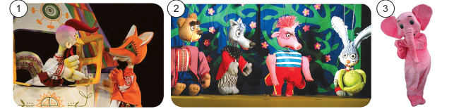 Розглянь світлини та пригадай назви видів театральних ляльок. Назва ляльки, величиною з людину, або це актори переодягнені в ляльку.