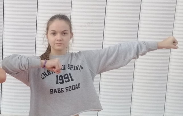 Як називається позиція при якій одна рука зігнута перед грудьми, а друга пряма в бік, кисті в кулак?