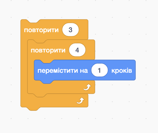 Проаналізуйте код на малюнку. На ньому зображені вкладені цикли. Скільки всього разів виконається команда "Перемістити на 1 кроків"?