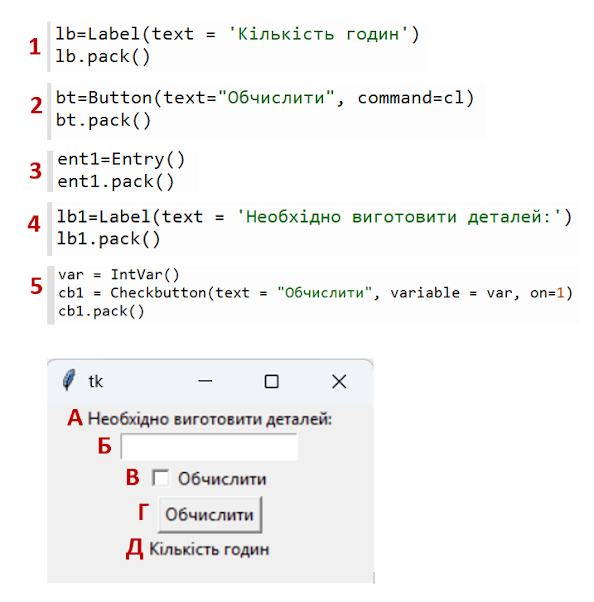 Встановіть відповідність між елементами графічного інтерфейсу вікна та відповідним кодом