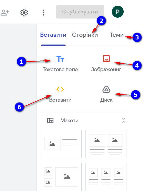 На бічній панелі розміщені інструменти для налаштування та додавання нових елементів на сайт. Якою цифрою позначений інструмент для додавання документу з Google Диска на сайт?