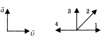На лівому рисунку зображені вектори швидкості та прискорення тіла. Який з чотирьох векторів на правому малюнку вказує напрямок імпульсу тіла?