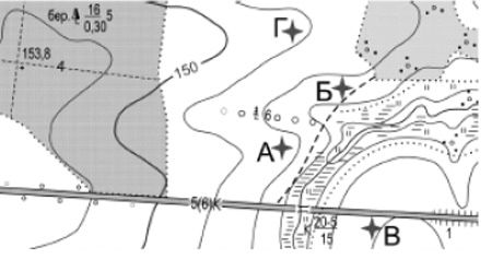 Найбільшу абсолютну висоту має точка, позначена на фрагменті топографічної карти буквою