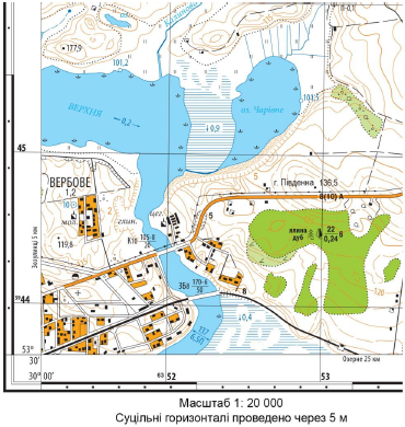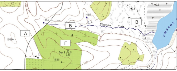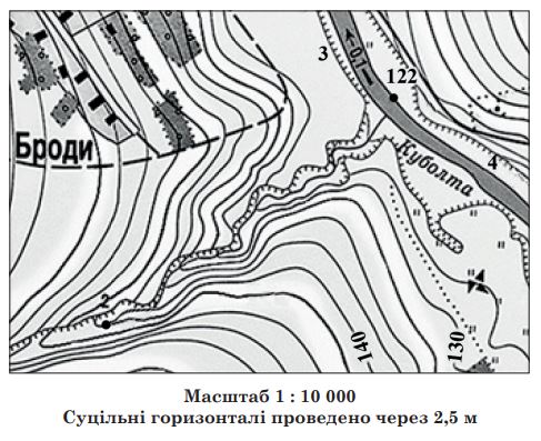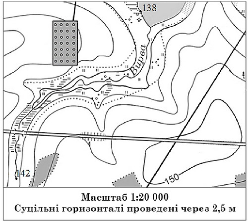 Знайдіть на фрагменті топографічної карти умовний знак колодязя. Визначте абсолютну висоту (у метрах) точки, у якій розташований колодязь. Суцільні горизонталі проведені через 2,5 м.
