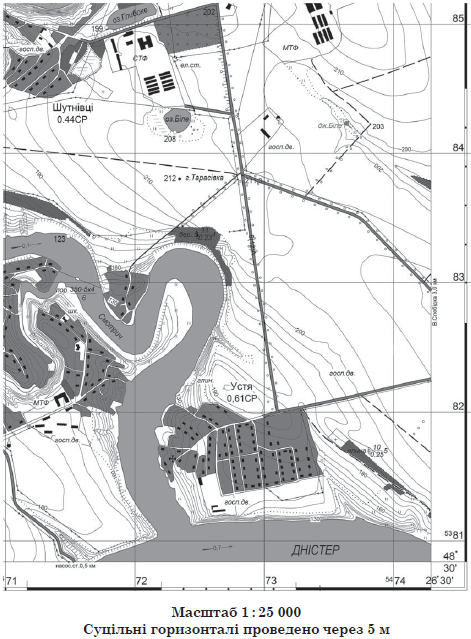 Визначте відносну висоту гори Тарасівка щодо урізу води в річці Смотрич (у метрах).