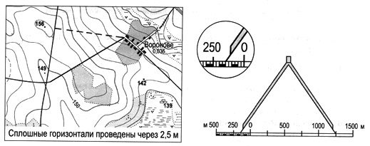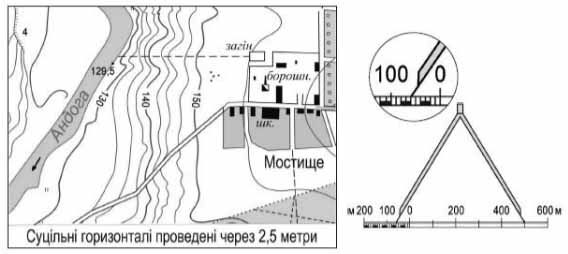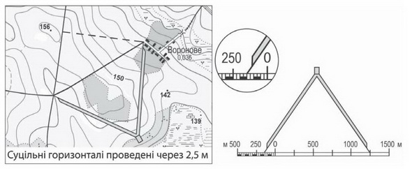 На топографічній карті відстань уздовж дороги від перехрестя доріг до околиці села Воронове виміряно циркулем і зіставлено з лінійним масштабом (див. рисунок). Визначте, якою буде ця відстань (у метрах) на місцевості.