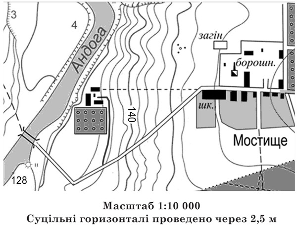 Відстань уздовж стежки від річки Андоги до загону для худоби біля села Мостище виміряно на карті й зіставлено з лінійним масштабом. Використовуючи рисунок, визначте цю відстань (у метрах).